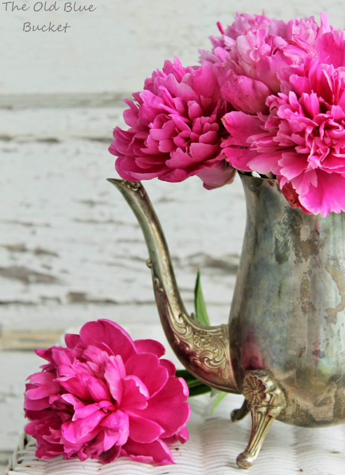 When planting my flowers I use a variety of containers. I have a lot of concrete & cast iron urns that I use. I have a weakness for urns ~ can't seem to pass them up at auctions! I use a lot of terra cotta pots because I love the natural earthy look of them. I also like to include a few vintage pieces every year that I've repurposed as planters. Here are a few that I've used this Spring as planters for my Violas...